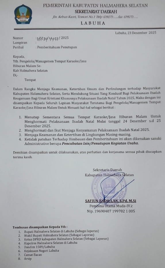 Labuha, Halmahera Selatan,InfoPublic.id – Pemerintah Kabupaten (Pemkab) Halmahera Selatan resmi mengeluarkan surat edaran terkait penutupan sementara tempat karaoke dan jasa hiburan malam selama perayaan Natal 2025. Kebijakan tersebut tertuang dalam Surat Edaran Nomor 188.34/4451/2025 yang ditujukan kepada seluruh pengelola tempat hiburan malam di wilayah Kabupaten Halmahera Selatan.