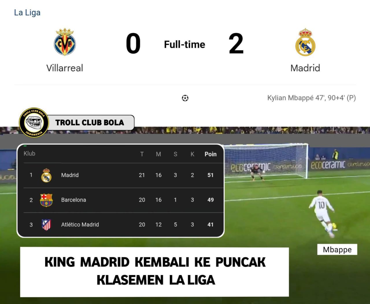 Valencia, Spanyol – Real Madrid berhasil meraih kemenangan telak 0-2 atas Villarreal dalam pertandingan La Liga yang digelar baru-baru ini. Kylian Mbappé menjadi pahlawan tim dengan mencetak dua gol pada menit ke-47 dan menit tambahan 90+4 (dari titik penalti), membawa Los Blancos kembali ke puncak klasemen La Liga.