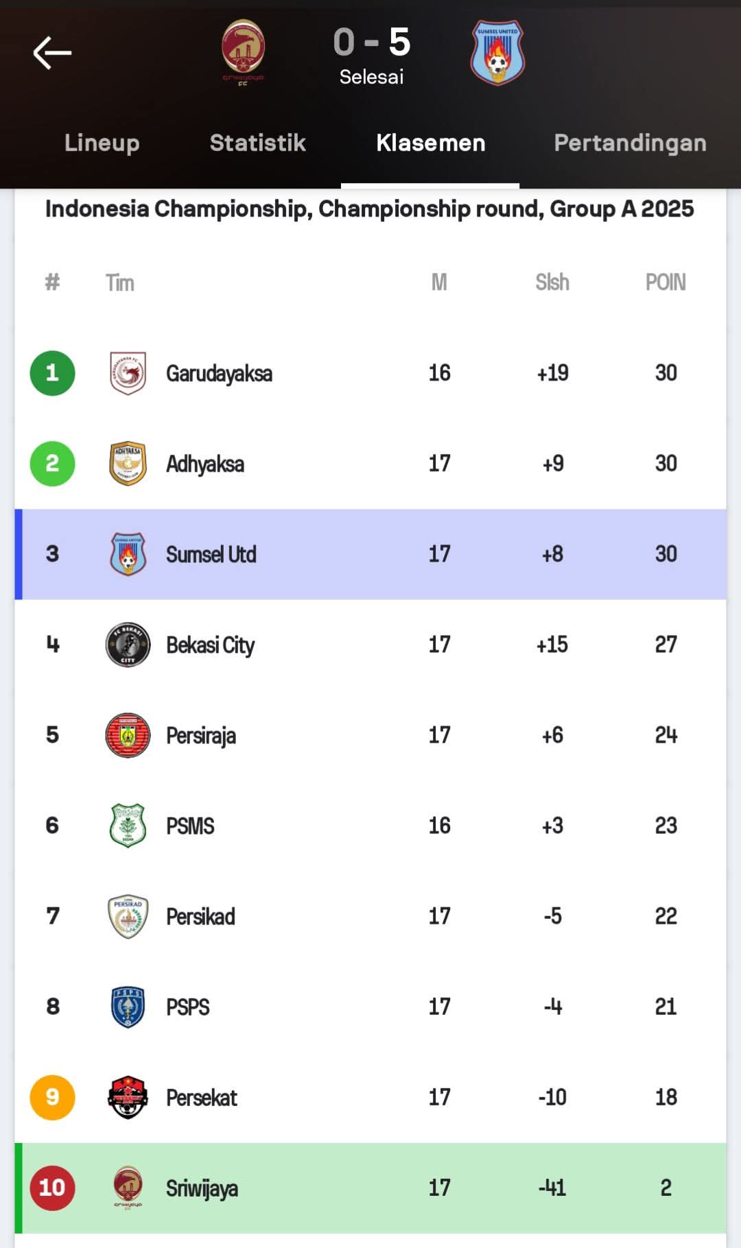 Ternate, 25 Januari 2026 – Sriwijaya FC harus menerima kekalahan berat dengan skor 0-5 dalam pertandingan babak Championship round Grup A Indonesia Championship 2025 yang telah selesai. Hasil ini membuat mereka tetap terjepit di posisi ke-10 (peringkat terakhir) klasemen dengan total 2 poin dari 17 laga yang dimainkan, dengan selisih gol negatif mencapai -41.